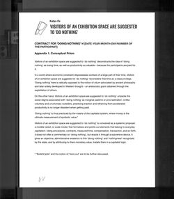 The pragmatic solipsism of contractual and legal circumscription here substitutes for rather more lofty meditations on the ontology of ‘nothingness’. The performativity of legislative utterances is what makes the impossibility of ‘doing nothing’ appear as available and renders it practically realizable—but not really, as participants in Visitors will naturally experience first hand. In this context, it is worth recalling the example of the perception or experience of the absence of a friend in a café, which philosopher Jean-Paul Sartre uses in Being and Nothingness to demonstrate the dialectical entwinement of appearance and non-appearance, and ultimately of being and nothingness. Somewhat like Sartre's absent friend, the contract and the discursive framing affords a kind of perception of nothing(ness), and sets off a series of reflexions on a paradoxal nature of such perception." Steyn Bergs, "Nothing/Doing: On Visitors of an Exhibition Space are Suggested to ‘Do Nothing’", TIM Magazine #2, 2021 full text here