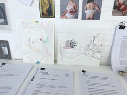 Katya Ev’s Lactating Bodies articulates a de-romanticized and critically engaged perspective on lactation, framing it as a site of socio-political inquiry and gendered embodiment. The project disrupts idealized, sanitized, and often heteronormative representations of breastfeeding by centering the lived realities of lactating bodies, including the messiness, labor, and discomforts that are rarely made visible. By incorporating elements such as leaking milk, breast pumps, stains, and other visceral details, Ev opens space for a broader, more inclusive discourse around care, corporeality, and reproductive labor [...]" exhibition text by scholar Mathilde Cohen